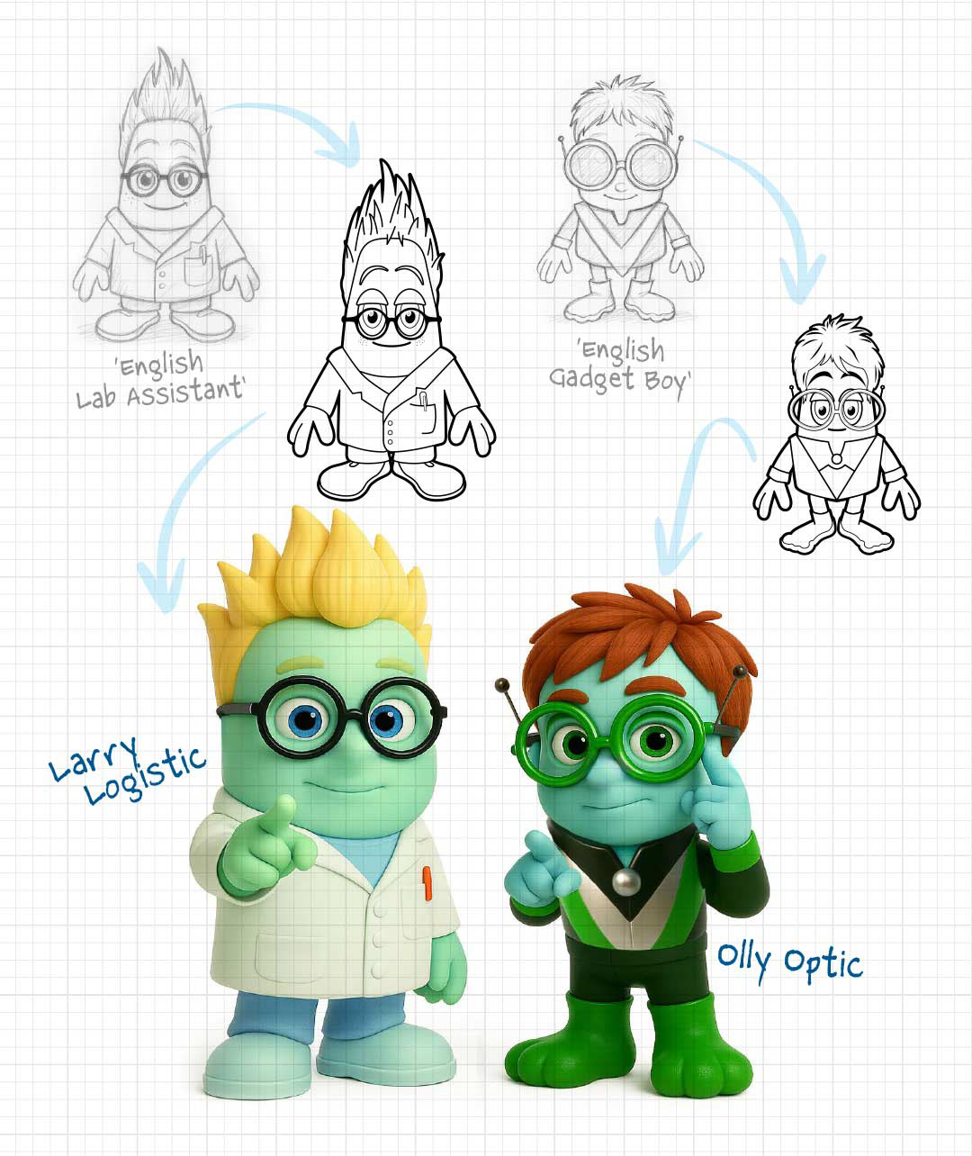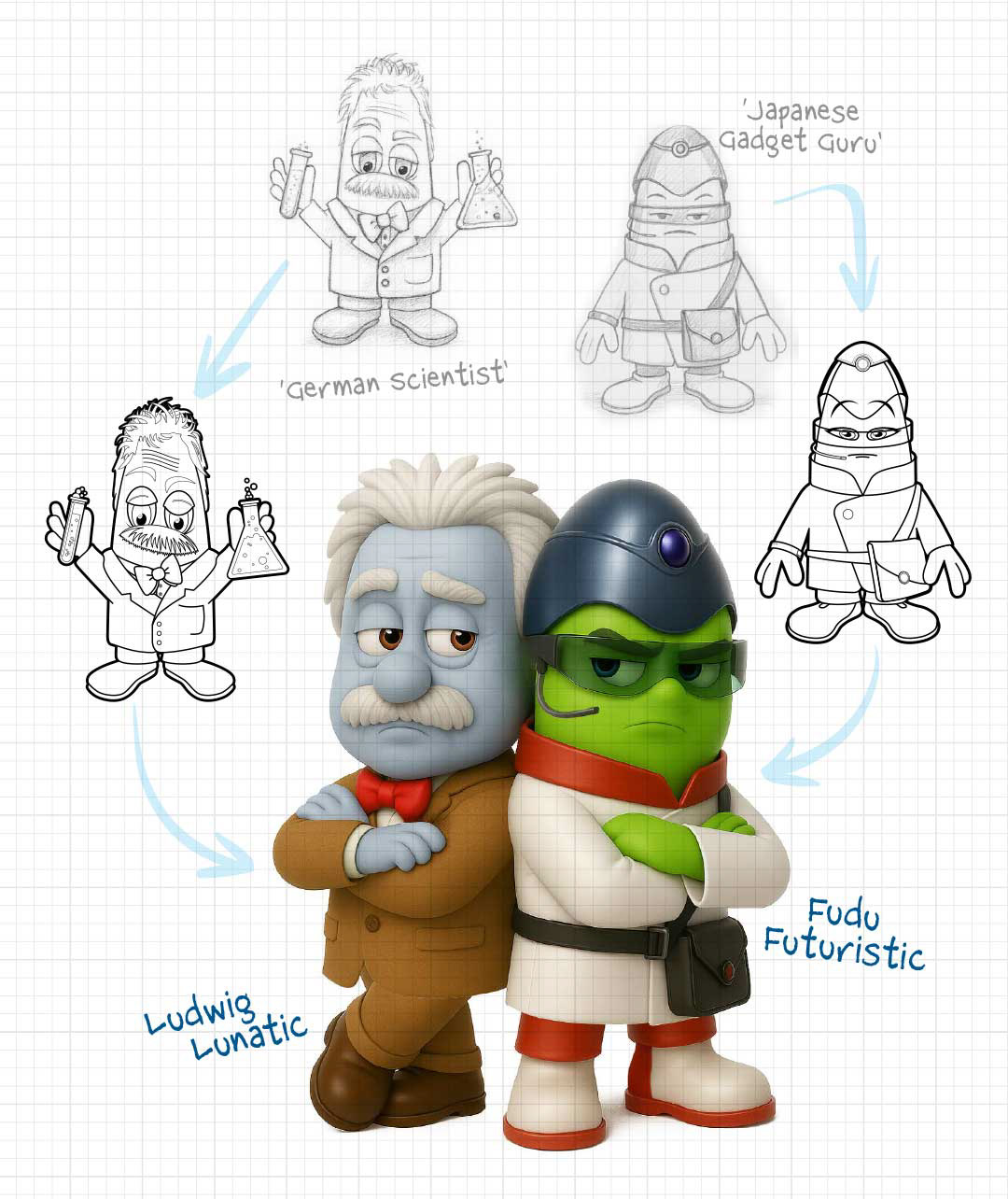Step inside the creative process that shaped the four time-travellers. Their development began with loose exploration sketches that defined attitude, proportions, and direction. These early concepts were translated into vector designs, establishing the structure and visual language for each character. The final transformation into 3D brought them fully to life with detail, personality, and expression. Below, you’ll see the full progression - from first concepts to the final 3D forms of Ludwig Lunatic, Fudu Futuristic, Larry Logistic, and Olly Optic.